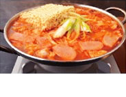 肉・野菜・豆腐にソーセージ(ランチョンミート)・乾麺といった食材を辛みのスープで煮込んだ韓国の大衆鍋